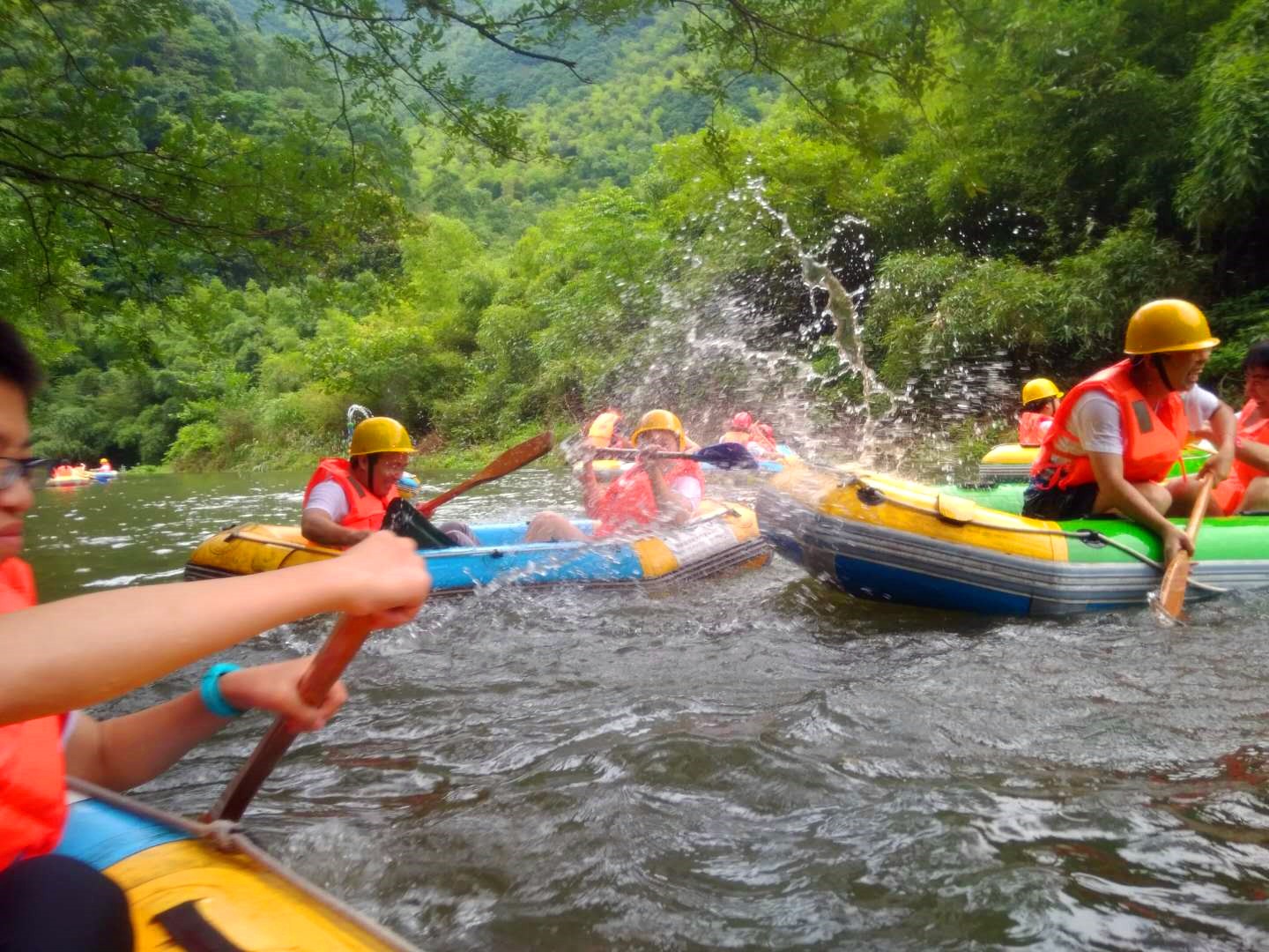 漂流總長3公里,河道巖石裸露,溪道曲折,沿途有石拱古橋和竹林,景色優(yōu)美,只是還來不及好好欣賞,一場水仗拉開了序幕,唉,都是一些老小孩了( ̄▽ ̄)/。