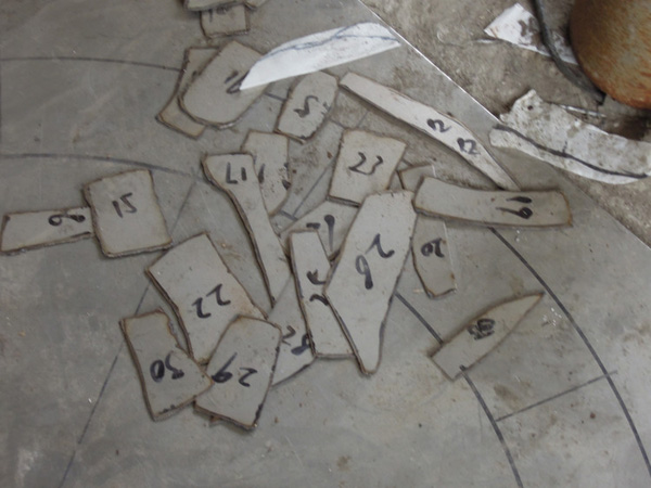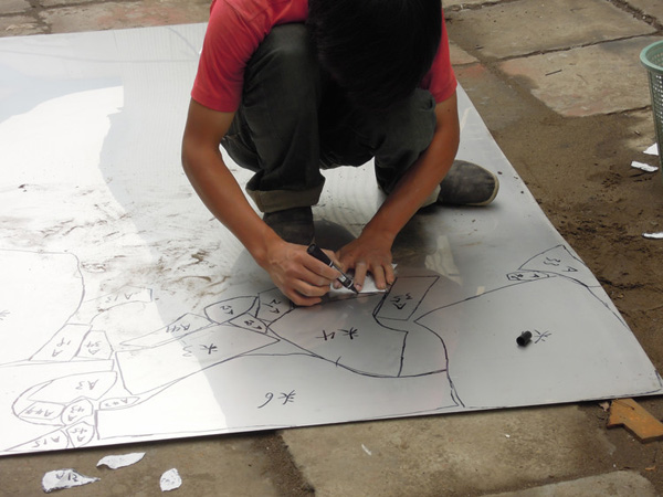 用玻璃鋼制作的模型強度會比較好,不用擔心像泥塑的模型那樣容易碰壞。采用冷作加工的方式時,工人們會將整個雕塑的外表面分割成很多個小塊,并且會對每個塊進行編號。用于不銹鋼冷作加工的原材料是事先做好的不同厚度的不銹鋼板,工人們需要在不銹鋼板上根據編好號的每一個小區(qū)域,畫出與之對應的形狀。由于不銹鋼板是平面的,而雕塑作品的表面是立體的,所以一是每個小塊的面積不能太大,另外每個小塊也需要留有一定的余地來方便之后的加工。
