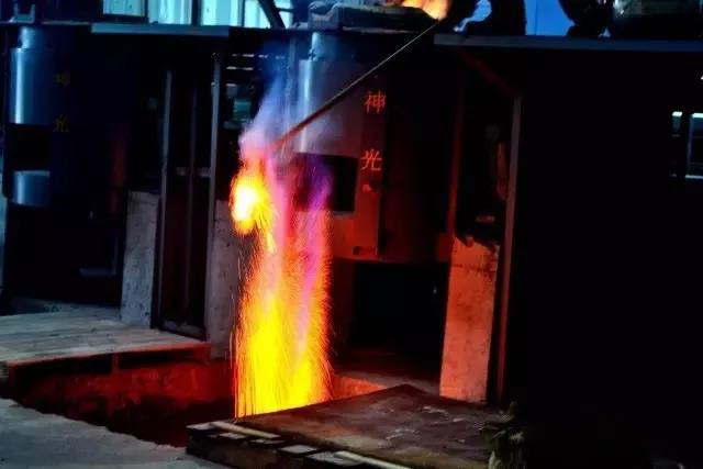 ▲傾瀉而下的銅水如火山熔巖一樣